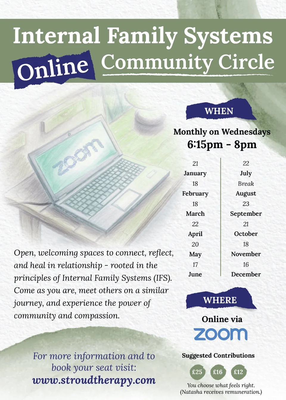 Tickets released at the beginning of the month. £12-25, to receive zoom link. Please note pricing change for 2026. If you are able to afford it please do contribute as generously as you can to enable those who can’t to have the opportunity to come. Please don’t let price put you off, be in contact if you can’t afford these prices and we can work something out. Limited to max 18 attendees. Proceeds stay with Natasha.