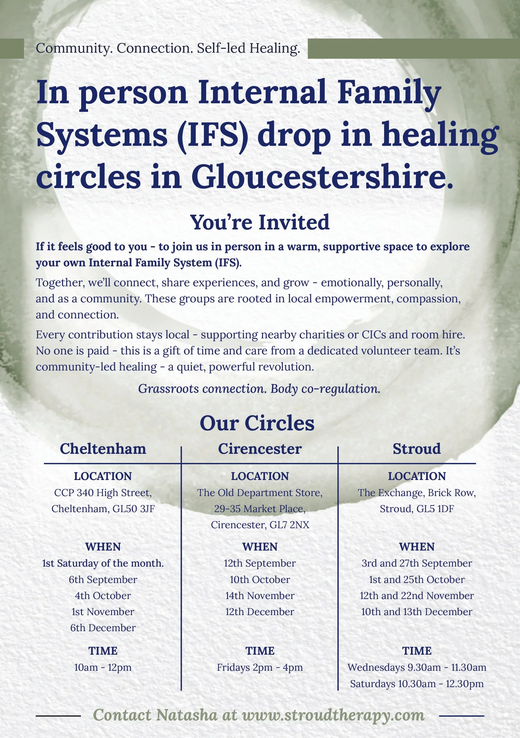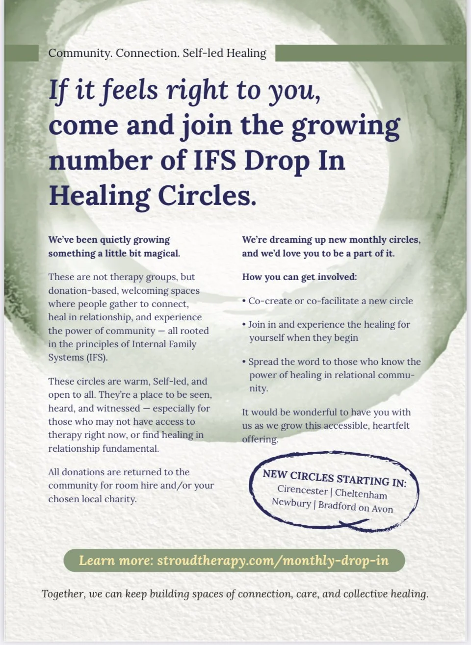 These monthly circles (in Stroud) are so filled with Self energy and warmth and connection. Everyone is welcome, so the experienced and the curious. The main idea is around finding IFS community at a grassroots level, sharing Self energy and also being of service to the community - donations go to local charities/for room hire.