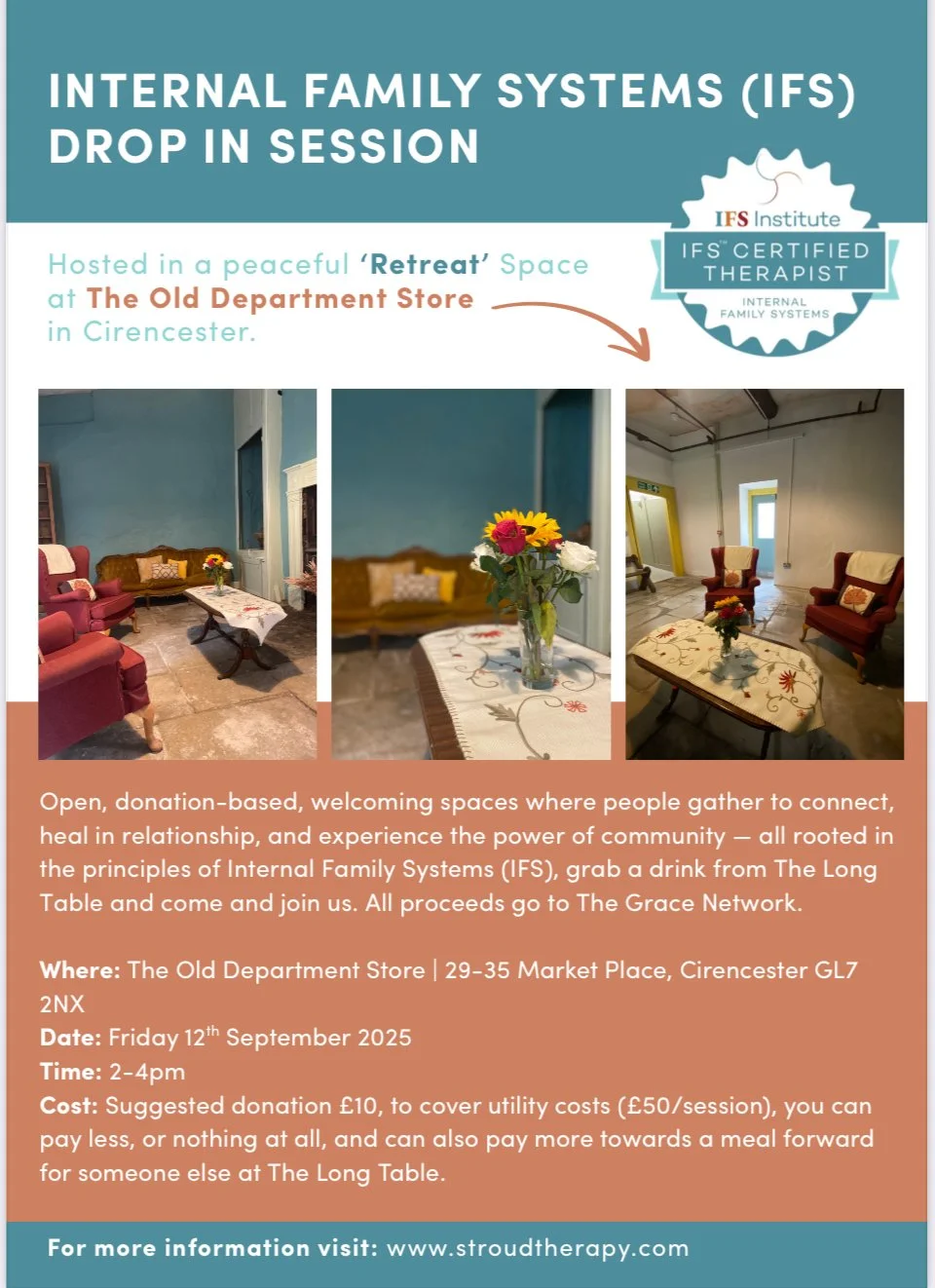 Starting this month, Cheltenham and Cirencester will be joining Stroud in hosting warm, welcoming, community-led IFS circles right here in Gloucestershire.